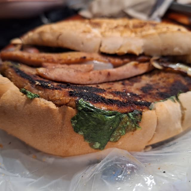 Esta torta de milanesa con salchicha es deliciosa y grande (para alguien que no come muchísimo, alcanza para comida y cena 😋) está preparada con jitimate, aguacate, pepinillos, lechuga, frijoles y veganesa, así como la salsa de tu elección o chiles en vinagre.