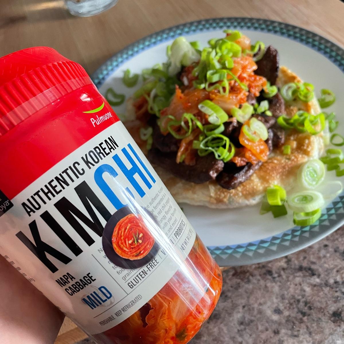 Perfectly balanced classic kimchi. Crunchy and flavorful, perfect addition to fried rice, noodles and in this case I made a taco with a Trader Joe’s scallion pancake with nasoya korean bbq plant based steak topped with the kimchi and scallions and a drizzle of Japanese bbq sauce. A lot of things going on but it went really well together. Very enjoyable. The kimchi added a hint of heat as it’s the mild version.
