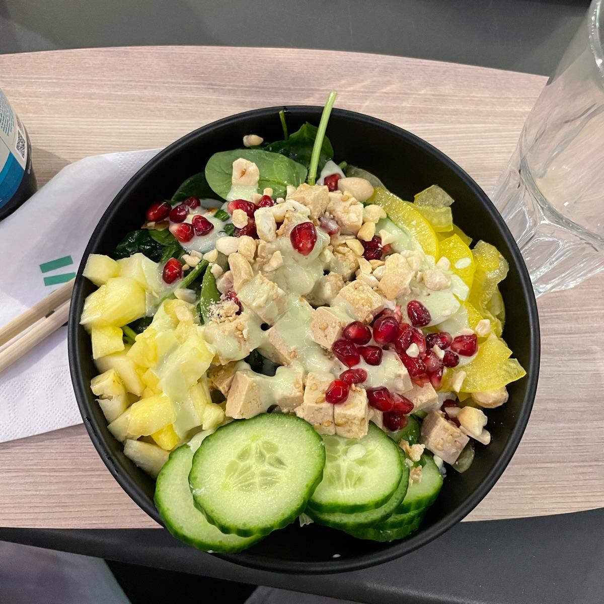 Delicious, and the tofu was not fried, something I find always as a plus! It could look nicer to the eyes 👀 but it was very tasty, loved the pomegranate and pineapple! 🍍