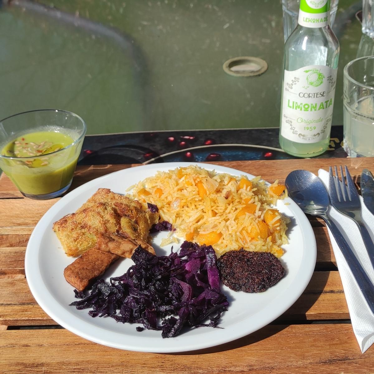 Piatto unico richiesto senza glutine oltre che vegano. Composto da riso basmati e zucca, pizza di patate, cavolo viola e frittatina di riso venere. In aggiunta una zuppetta di piselli con semi di girasole. Tutto buonissimo. Personale gentilissimo e chef molto brava! Disponibilità a spiegare come funzionasse (offrono piatti unici con alimenti di stagione e oltre a birre e vini anche bevande analcoliche biologiche di un' azienda italiana). Prezzo del piatto unico €15.