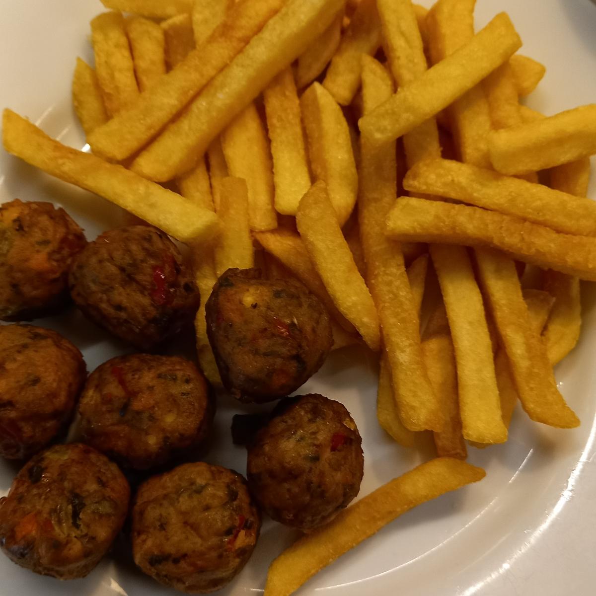 crispy fries with the best vegetable balls ever plus some green peas. yummy and cheap (about 5-6€ or so)