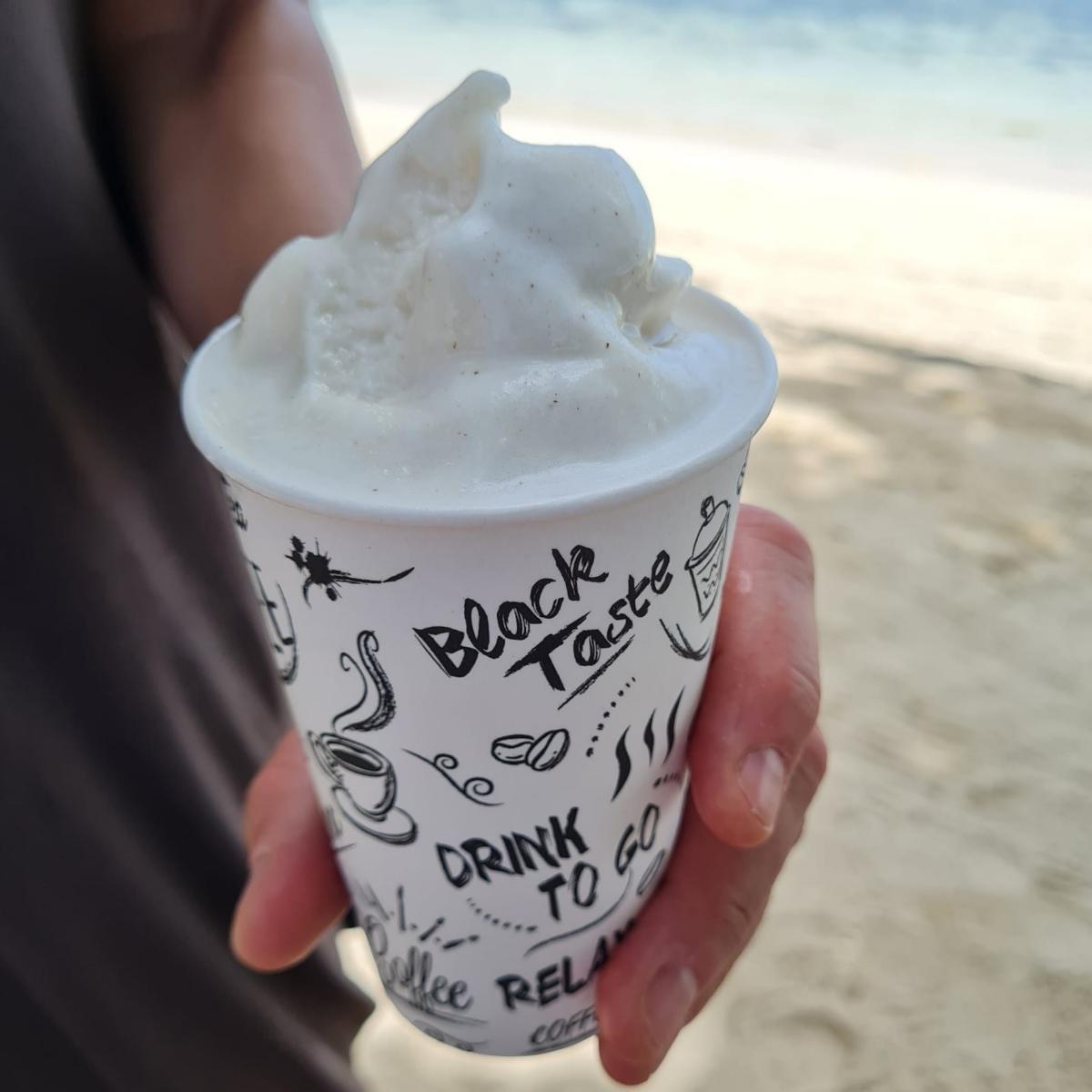 Primo sorbetto al cocco di questa vacanza in Guadalupa. Buonissimo! Non so se saranno tutti così buoni. La signora che me l'ha venduto mi ha detto che non conteneva latte anche se nella ricetta originale ci dovrebbe essere il latte condensato, mi sono fidata... Speriamo. Non è troppo dolce, è molto cremoso e fresco. La grana del ghiaccio è molto fine e si scioglie facilmente. Viene prodotto a mano con una macchina tipo zangola per il burro. 3,50€ per un bel bicchiere, direi economico.
