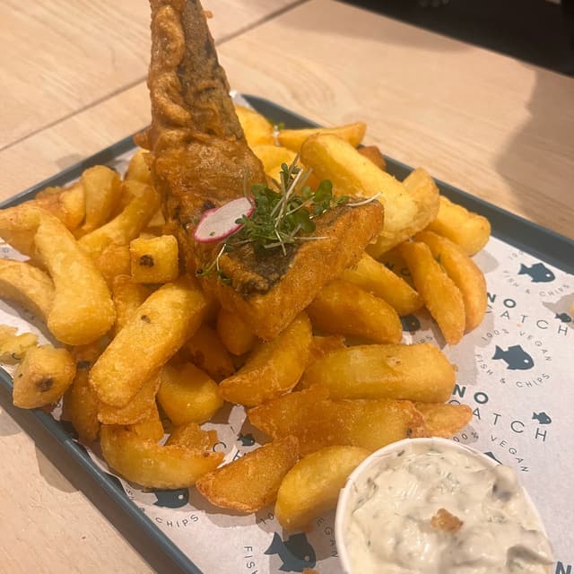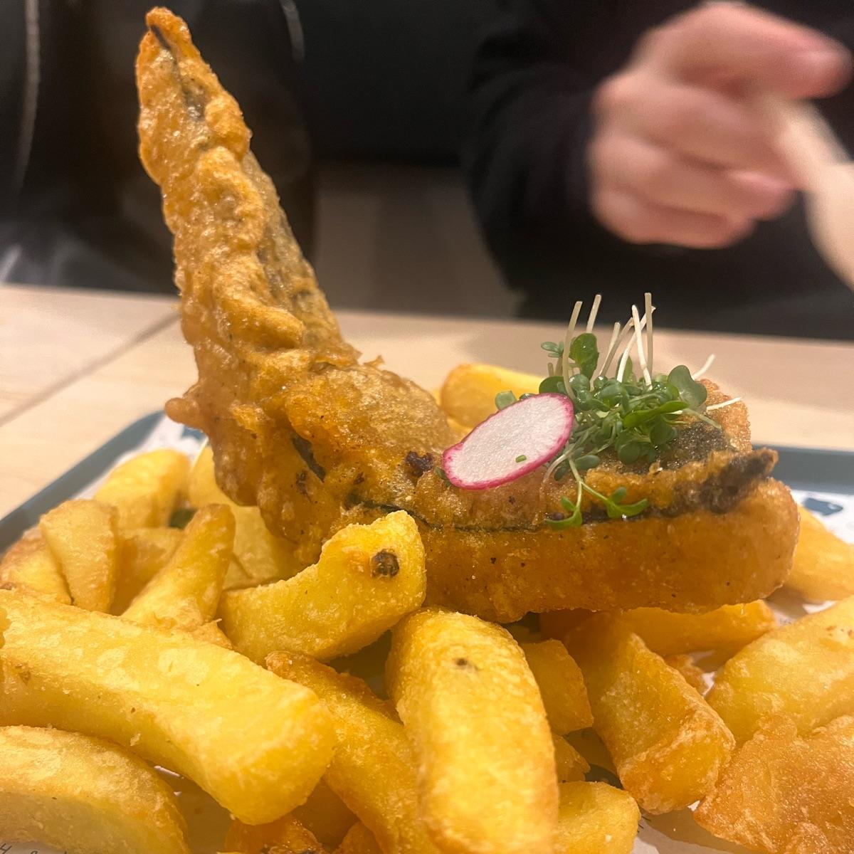Viene con una buena ración de patatas y limón. Puedes acompañarlo de una salsa. Nosotros escogimos la recomendada (tartar) y le queda genial.