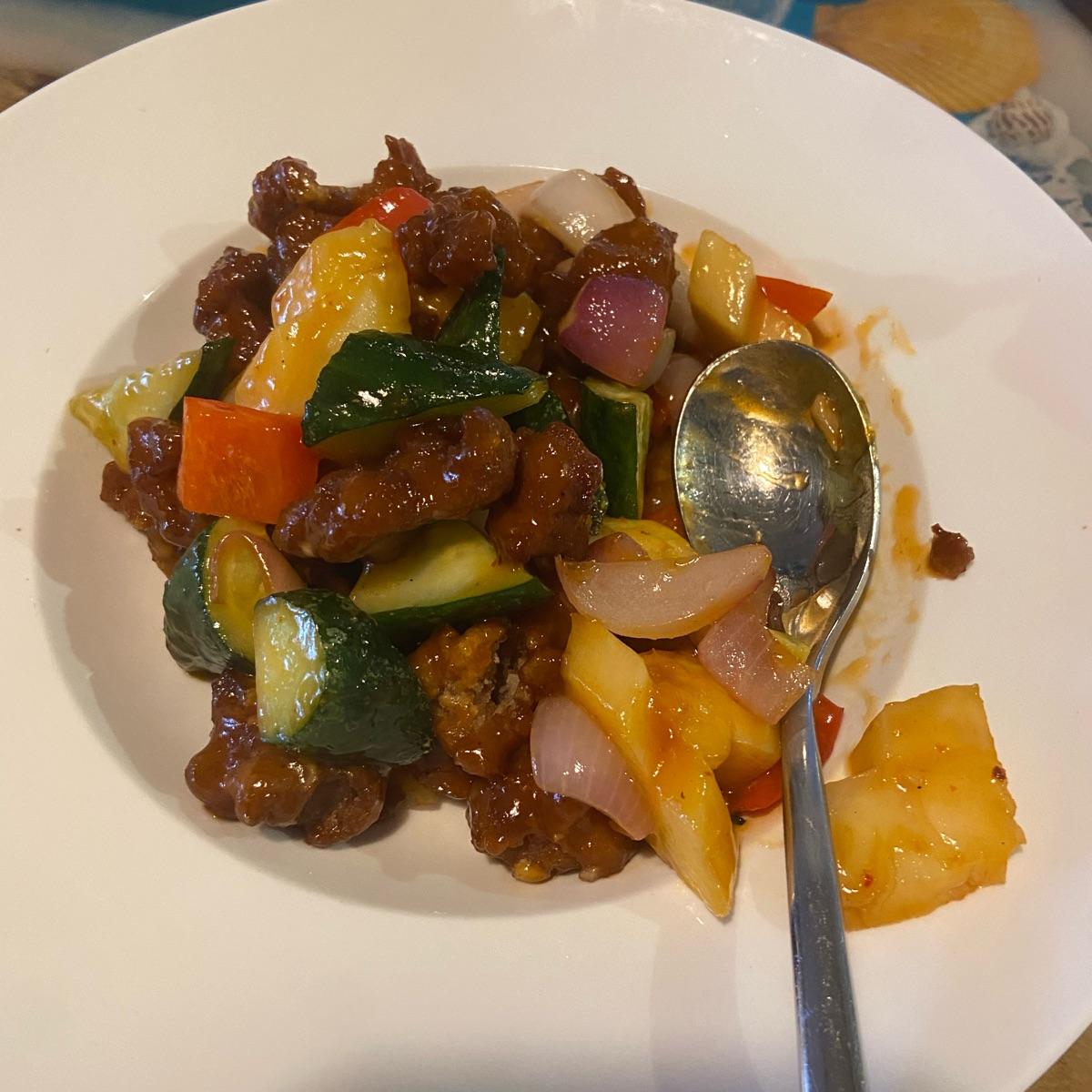 As far as I can remember, this has to be one of the best vegan sweet & sour pork I’ve had! The texture of the meat chucks are on point and the sauce is also super tasty.