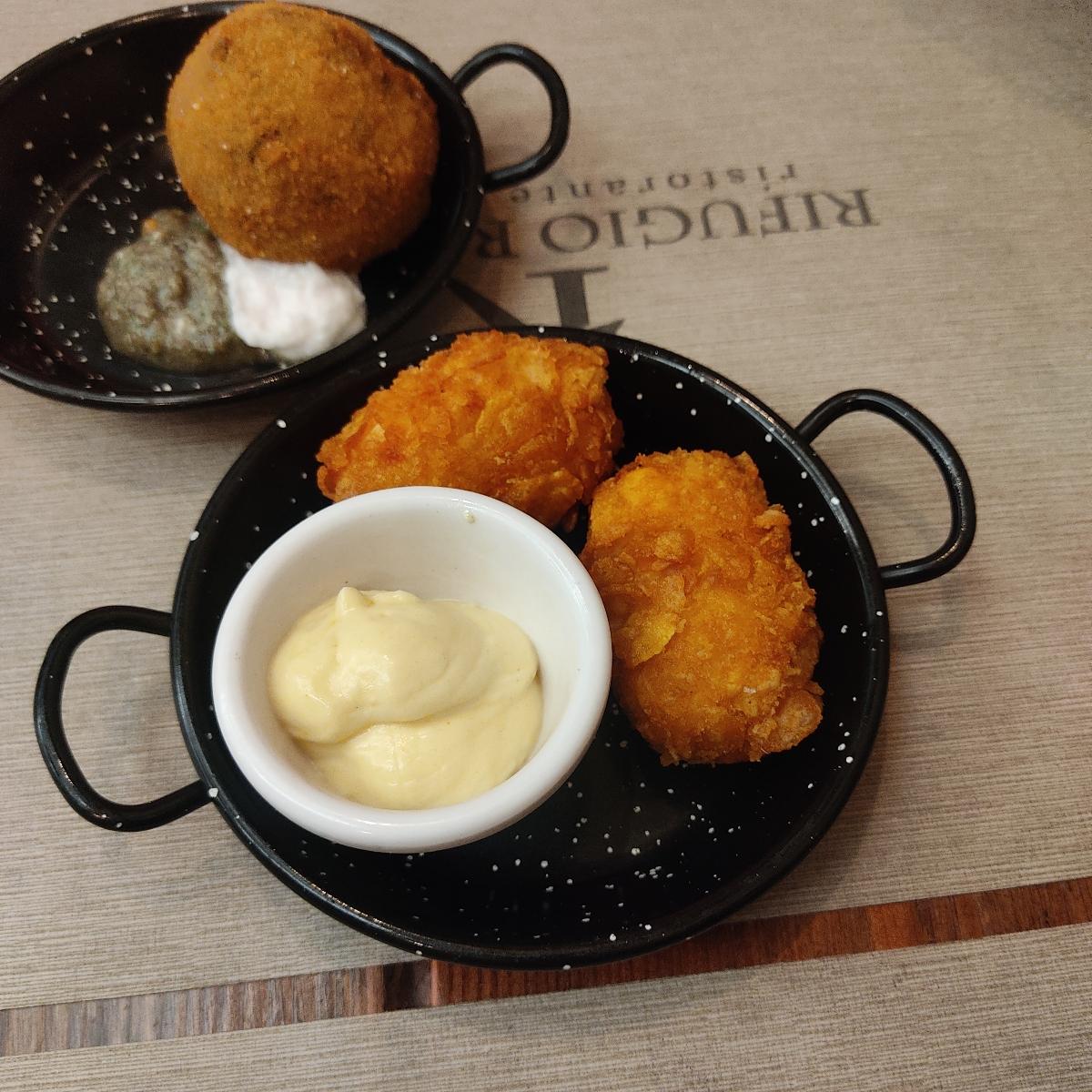 Due crocchette buone buone e con formaggio super filante dentro. Sembravano fatte di purè fritto da quanto erano morbide, un antipasto che mi piacerebbe riprovare prima o poi ehehe