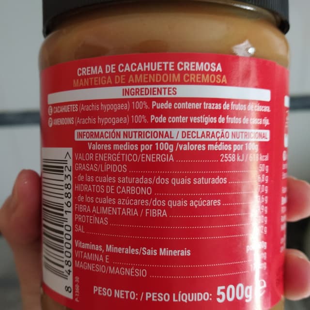 Bote de crema de cacahuete 100%, sin azúcares añadidos ni grasas extra. Está deliciosa. Es muy contundente. Tiene un alto aporte de calorías y de proteínas, así que va genial si entrenas a menudo.