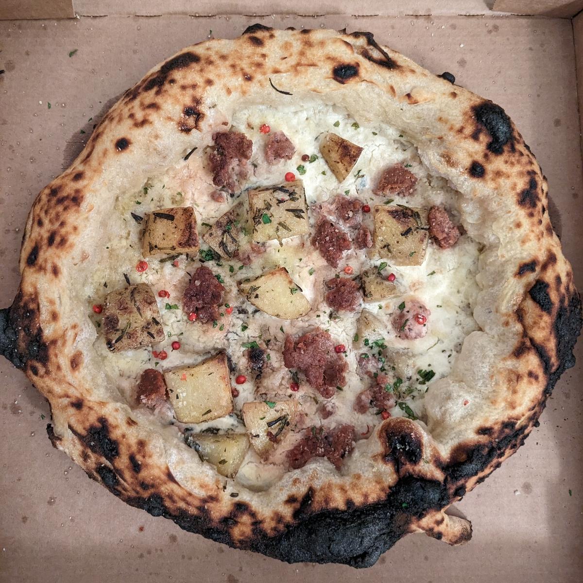 Pizza Helmut with its fried potatoes, vegan salsiccia and pink pepper is any savoury pizza lover's sourdoughy dream.