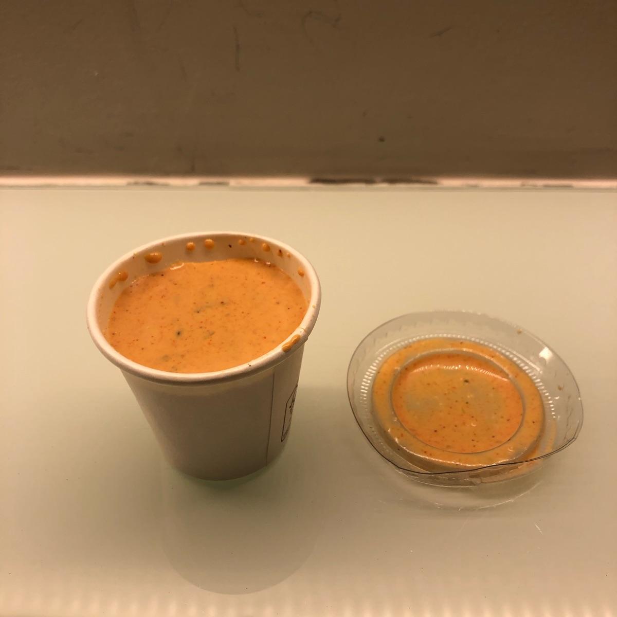 Pedi esse molho à parte para comer com as #batatinhas. Ele tem a consistência mais líquida que cremosa e isso não gostei muito. Ele é bem diferente e forte. Eu gostei do sabor. Não sei ao certo de que é feito, mas pela cor acho que tem molho do #tomate e alguma #ervas.