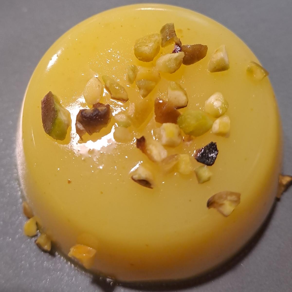 Una sorta di mousse gelatinosa con sopra granella. Sa molto di arancia. Dolcetto piccolo, per il suo costo, ma buono.