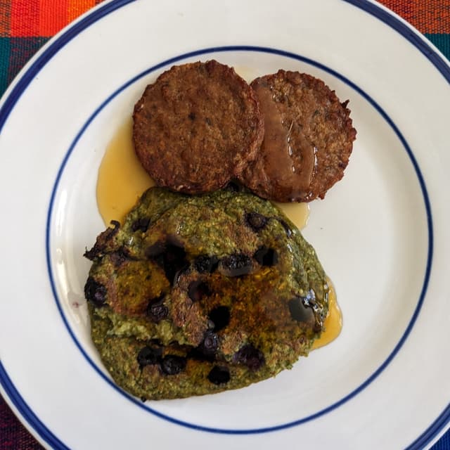 These have a great dense texture, delicious flavour that isn't too salty, and they're fairly healthy! Delicious with spinach banana blueberry pancakes and maple syrup! #breakfastsausage #vegansausage #veganmeat #breakfast #veganbreakfast #sausagepatties