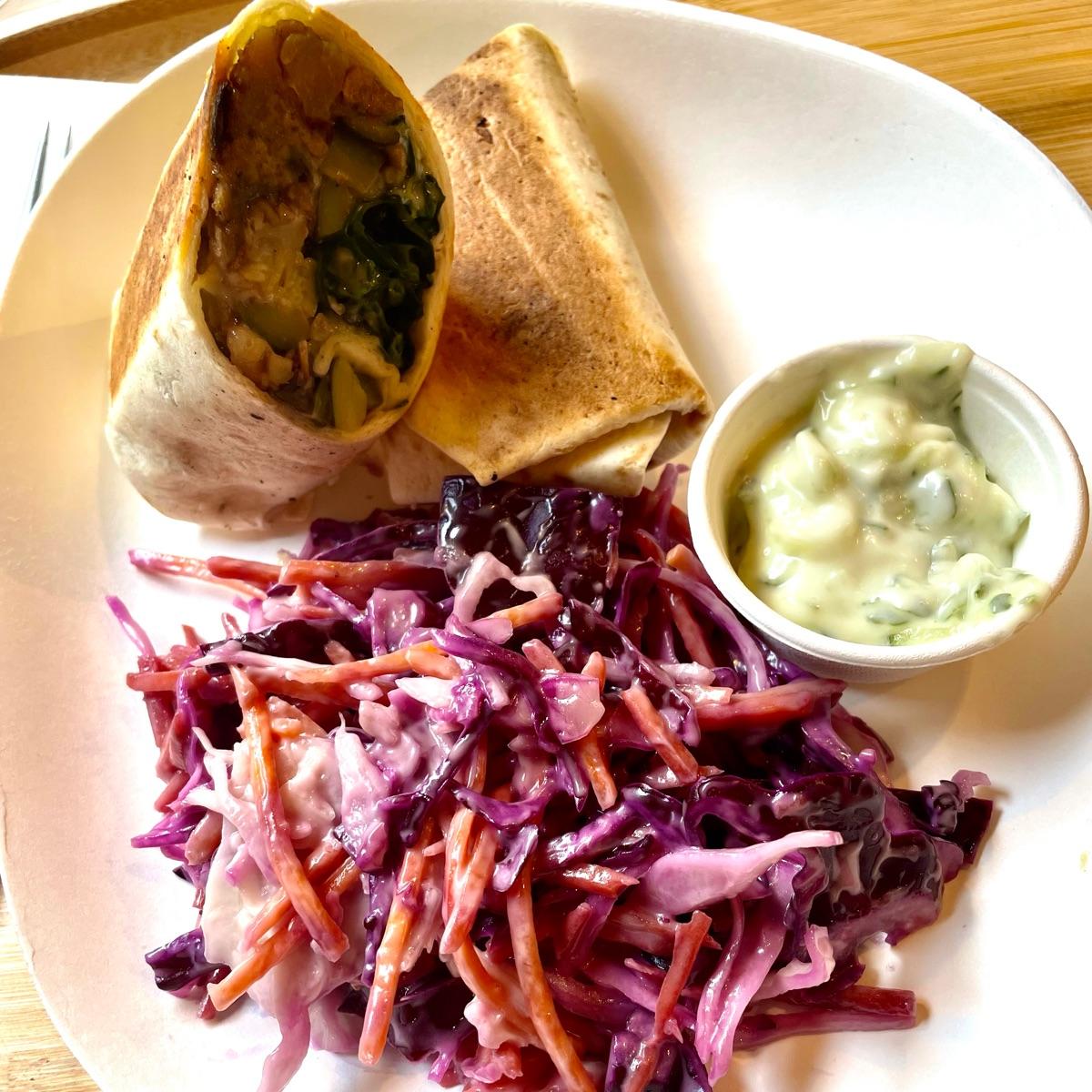 Ottima tortilla con polpette di legumi, zucchine, spinaci e noci, accompagnate da coleslaw e tzatziki. Super saporita e delicata allo stesso tempo! Consigliata!