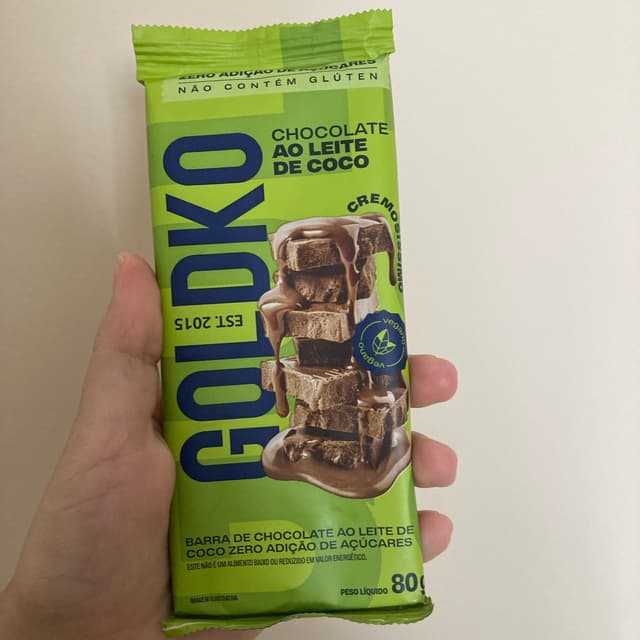 Adorei esse chocolate ao leite 🥛 de coco 🥥 da GoldKo! 😋 Ele é bem cremoso, macio e é daqueles que derrete na boca. Apesar de não ter açúcar, ele é bem docinho. E embora tenha leite de coco, não é aquele tipo de chocolate que acentua o sabor do coco!