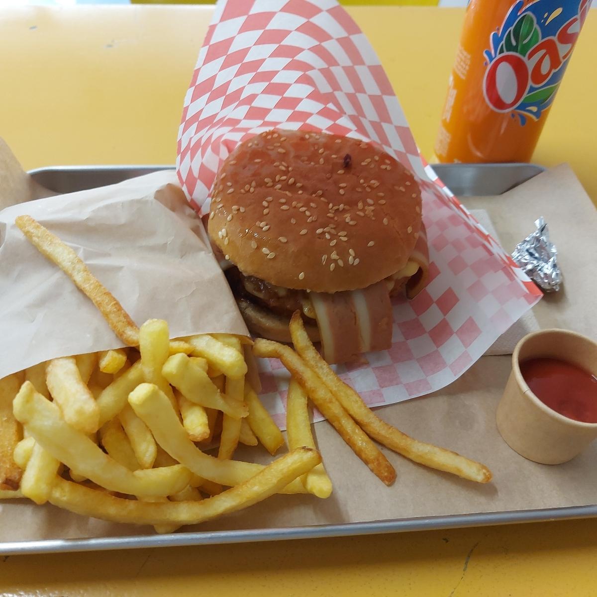 Papas abundantes, gaseosa y una Hamburguesa bastante original y rica. Un poco chica pero por el precio está bien.