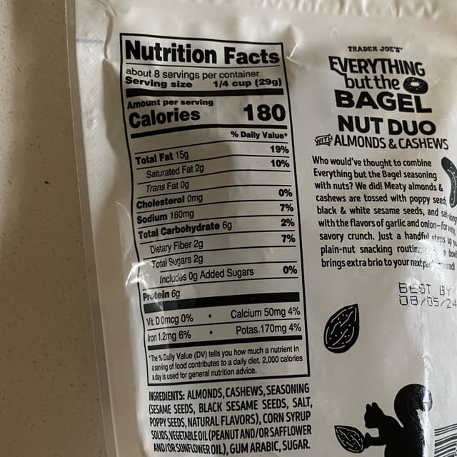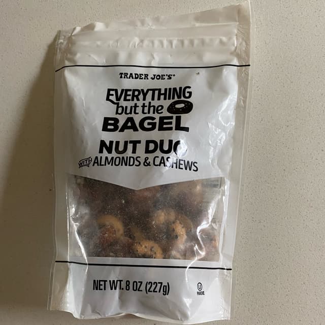 A combination of almonds and cashews. Although felt that the corn syrup and other additives unnecessary, this was crunchy salty and addictive.