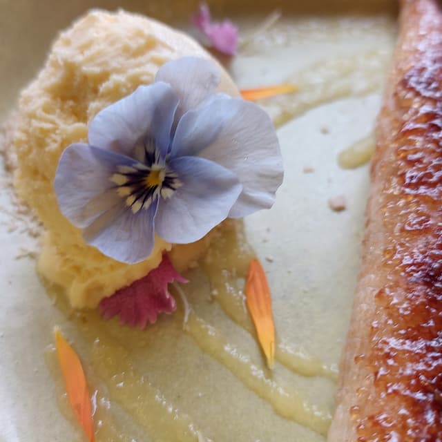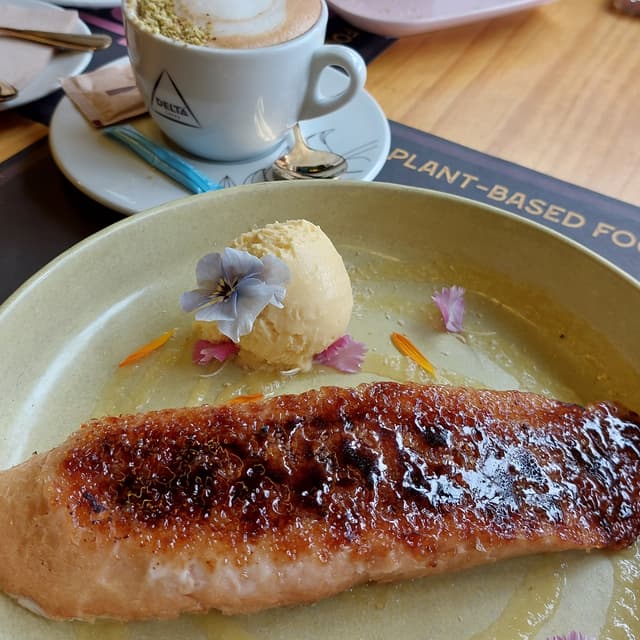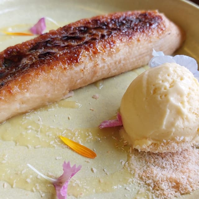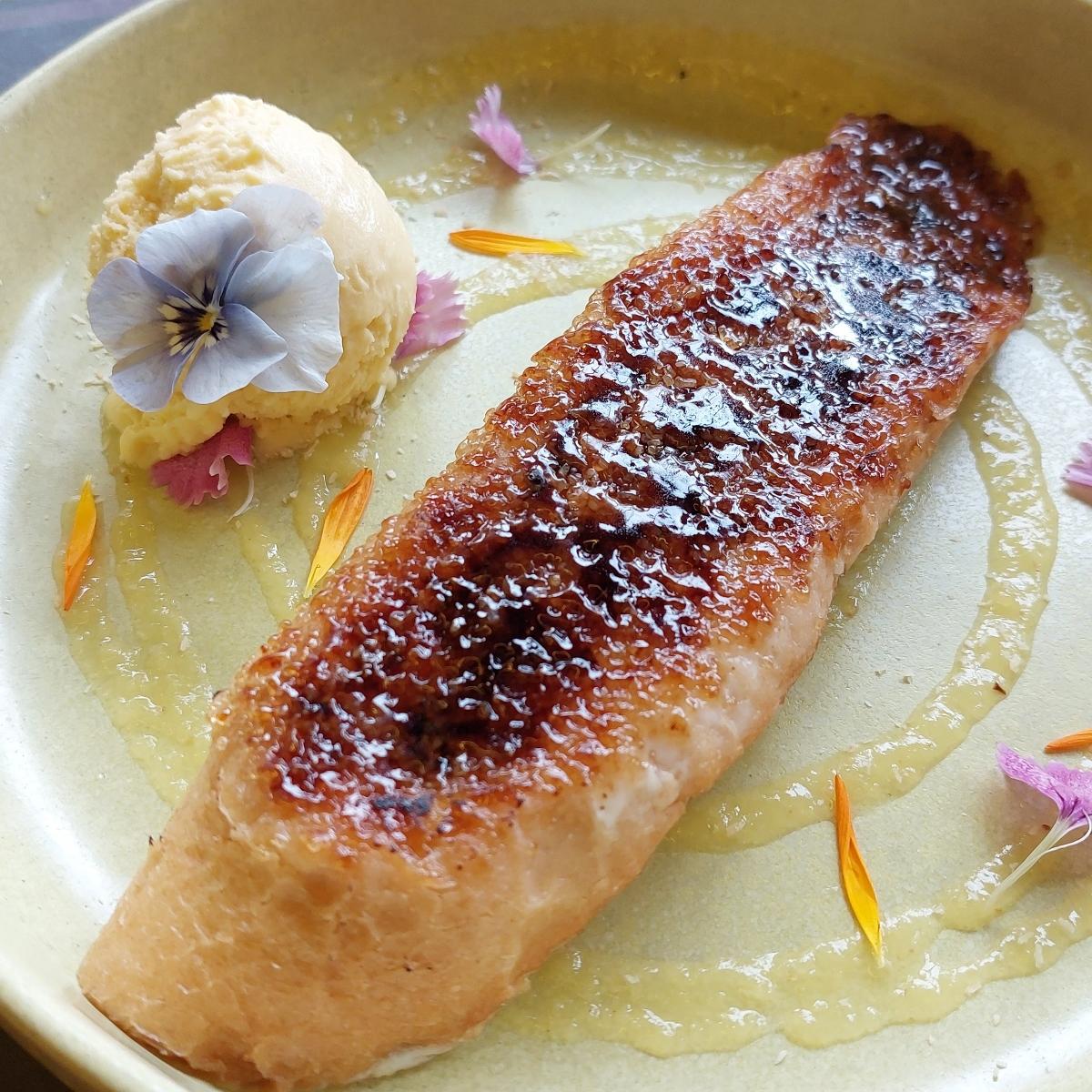 Me encanta, el sabor de la torrija es espectacular y el toque crujiente del azúcar de encima la hace única. El toque del helado y el puré de fruta que acompaña la torrija es espectacular. 💚