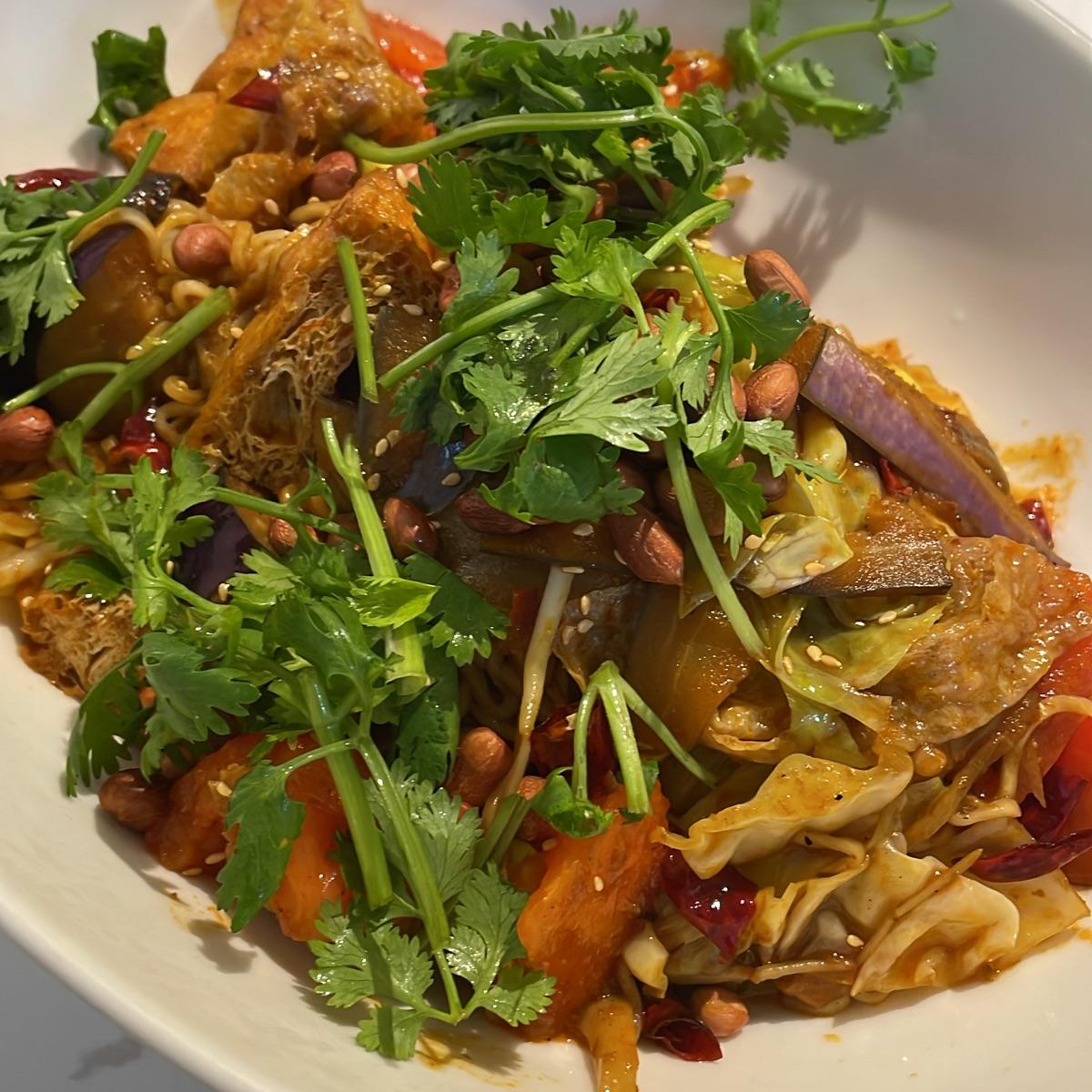Mala Xiangguo is a Chinese dish that originates from the Sichuan province. It is a spicy and flavorful dish that combines the heat of Sichuan peppercorns with the numbing sensation of Sichuan peppercorns. The dish is typically served with a variety of ingredients such as vegetables, tofu, and mock meats, all tossed together in a fiery, spicy broth. It's a bold and flavorful dish that is perfect for those who love spicy heat. Some reviews mention that the dish can be addictive and that the flavors are intense. Overall, Mala Xiangguo is a popular dish that is loved for its bold flavors and spicy heat.