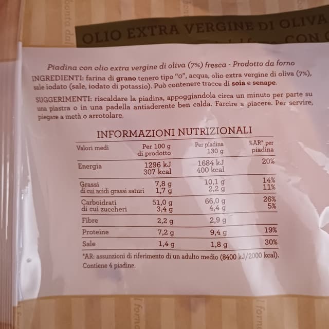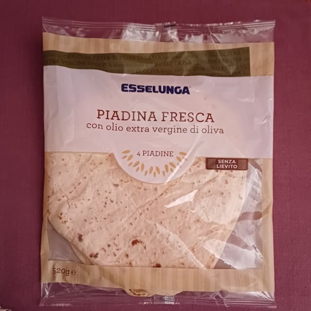 4 piadine fresche, da conservare in frigorifero, non biologiche ma a base di sola farina di grano di tipo 0, olio EVO (7%) e sale iodato.