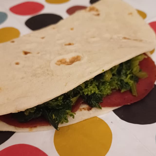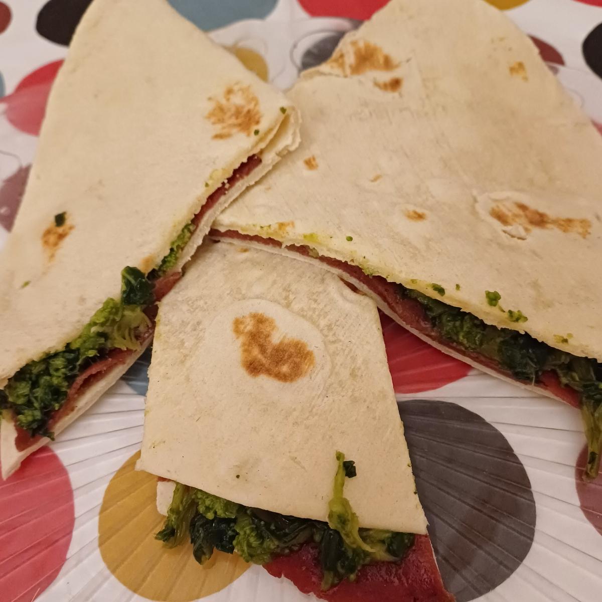 Riscaldata in forno é diventata croccantina e devo dire che mi é molto piaciuta. L'ho farcita con affettato veg e cime di rapa piccantine saltate in padella 😋.