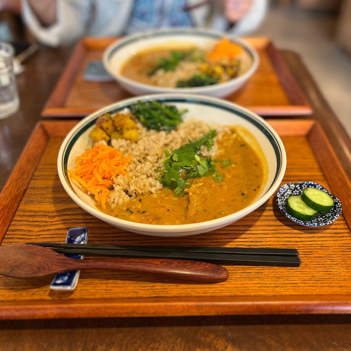 The curry itself is sweet and sour, somewhat different from a typical Japanese curry, and less thick. It does have quite a bit of coriander and cumin seeds inside.
