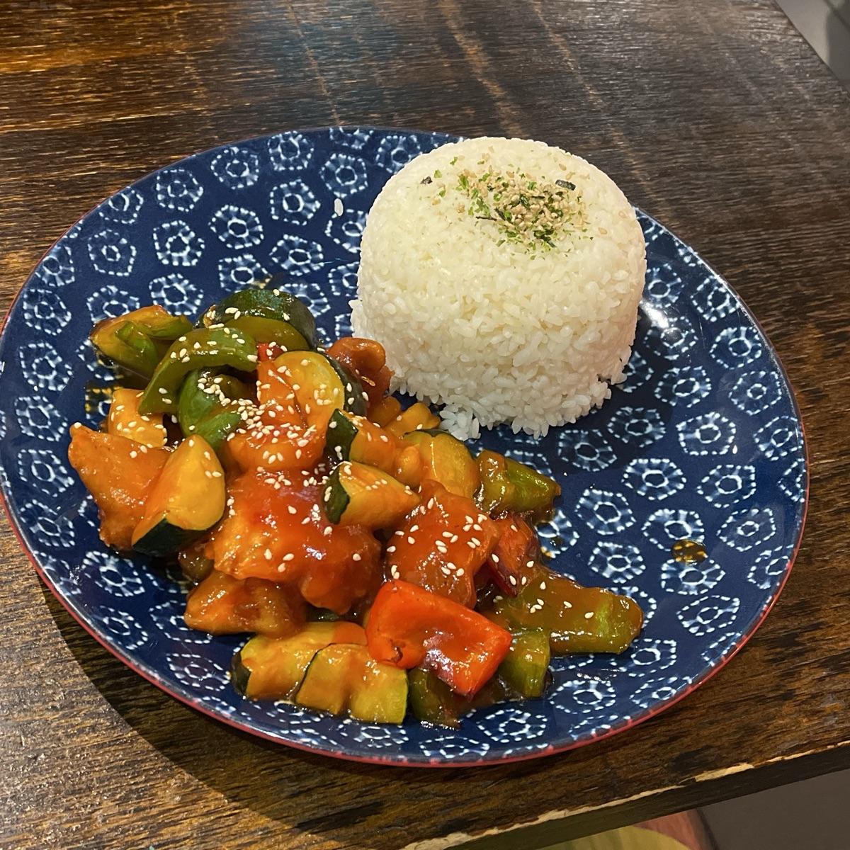 Diced capsicum, pineapple, sweet and sour pom pom mushrooms (aka lion's mane mushrooms) and rice. I was sceptical at first but yes as long as you are a #pineapplelover this is good! And maybe a fan of the sweet and sour combination. I am not generally, but thought this was good.