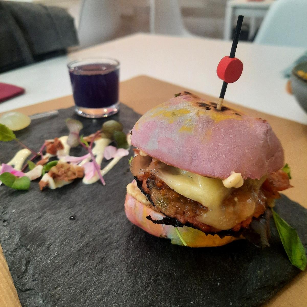 Plato con el que compitieron en el concurso de tapas Petisquiño 2023. Una pequeña hamburguesa para degustar, muy colorida como las que tienen en carta (en tamaño estándar). Con #quesovegano y una carne vegana. Además, venía acompañado de este #chupito al que le añadías el líquido de la pipeta para que cambiase de color. #eattherainbow