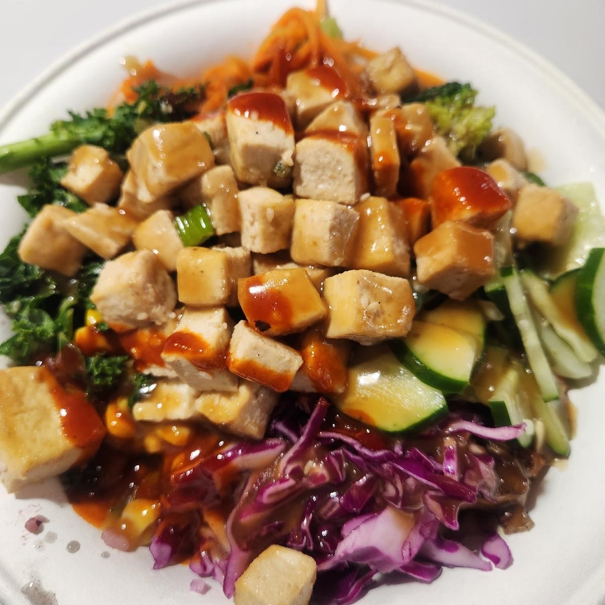 This is the #Tofu bowl with purple rice, carrots, cabbage, corn, cucumber and Kale. Topped with a bit of Sesame ginger and gochujang sauce. Bibibop never disappoints!