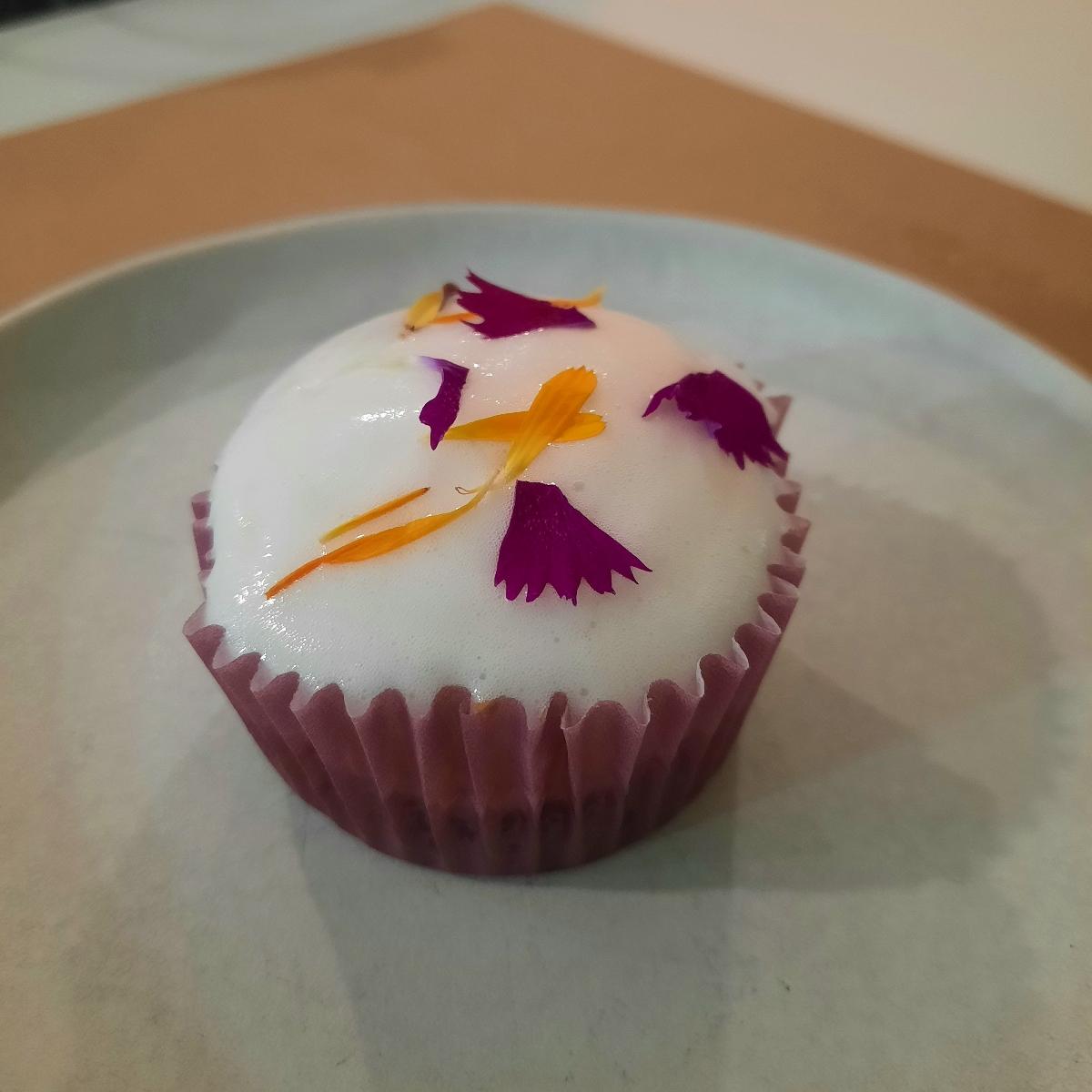 Riquísima esta #lemonpie en miniatura. Con una galleta en la base, crema de #limon, coronada con espuma y #flores. Local muy recomendado, con una decoración que os sorprenderá.