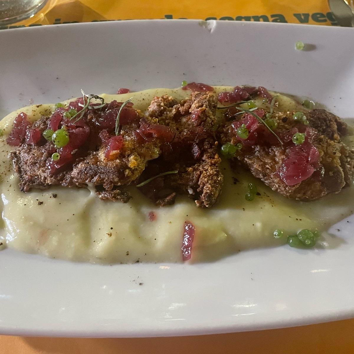 Il piatto si chiama “Le Bistecchine”: bistecchine di soia marinate con latte di cocco, salsa di soia e rosmarino su letto di crema di patate con caviale di basilico e cipolla agrodolce.🔝🔝🔝