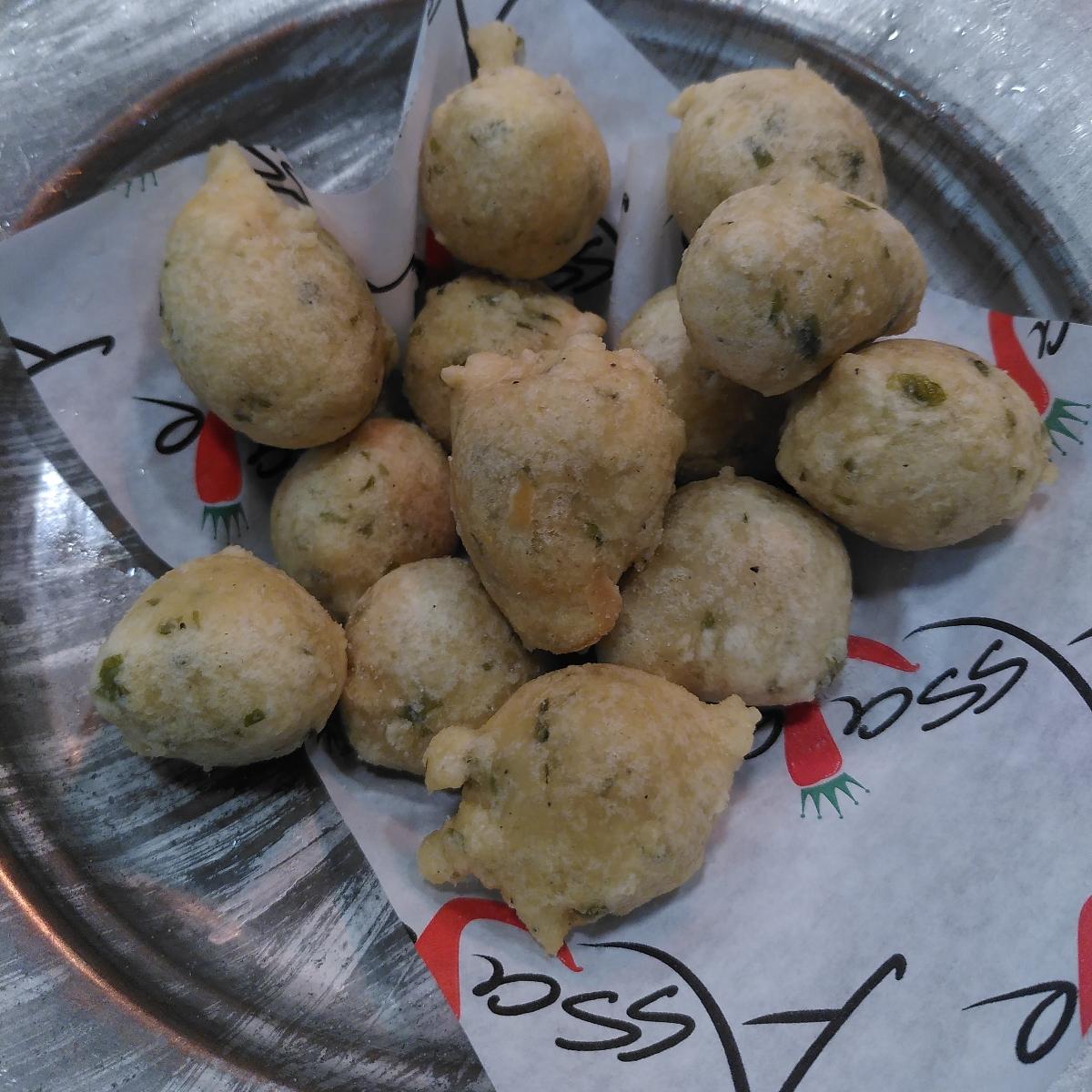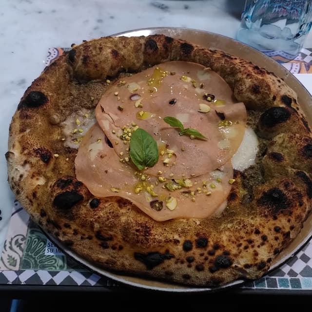 Più che altro è una scusa per recensire di nuovo il posto ma la pizza l' avevo già recensita per cui questa volta metto l'antipasto. Le zeppole sono palline di pasta della pizza fritte con alghe aggiunte nell' impasto. In genere alcuni vegani le evitano se vengono fritte nella friggitrice dove l'olio viene usato per tutto. Buona notizia, queste non sono immerse nell' olio, dall' aspetto sembravano fatte nella friggitrice ad aria, quindi immagino siano state cotte in forno con l' olio sopra. L' olio c'era ma non erano intrise. Questo potrebbe renderle meno interessanti per chi ama le classiche fatte appunto come la pizza fritta che grondano di olio. Io devo dire che erano diverse, i miei commensali soprattutto lo commentavano, ma non erano male , in particolare erano meglio quelle sotto, mantenute calde mentre le prime in superficie potevano sembrare un po' più secche. Molto buone ed apprezzate invece le Chips fatte da loro. La pizza con la mortadella vegana invece purtroppo è sembrata un po' troppo mentre è il motivo per cui i miei amici hanno voluto andare in questo posto. Io l'avevo mangiata solo in delivery e mi ha fatto piacere gustarmela sul posto appena sfornata. Consapevole che non sia una pizza leggera. Ero tentata di prendere la margherita vegan ma questa con pistacchio e mortadella la fanno solo lì e non è che ci capiti tutti i giorni. Inoltre andrebbe ricordato che anche la versione tradizionale non è sicuramente leggera! Quindi beh io sono stata molto soddisfatta della cena, certo non è il tipo di pizza che mangerei sempre. Inoltre al ristorante è disponibile birra non filtrata (io non bevo birra) ma non dolci vegani , vengono offerti dei liquori a fine pasto ma credo possa essere vegano solo il limoncello (anche a loro non sono interessata) che servono insieme a delle caramelle. Siccome l' altro commensale vegano ha fatto notare che nelle caramelle gommose "può esserci il maiale" , ci hanno portato dei lecca lecca colorati. Sinceramente non ho controllato tutti gli additivi (se ce ne fosse qualcuno di origine animale) tanto ero piena e me lo son portato a casa ma ho notato la scritta che avverte che alcuni additivi possono " influire negativamente sull'attività e l' attenzione dei bambini" e per fortuna non ci riguarda, ops 🤭