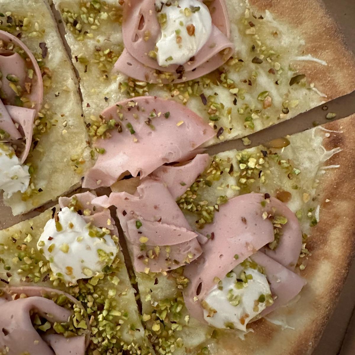 Pizza del Choose de mortadella y pistacho con queso vegano