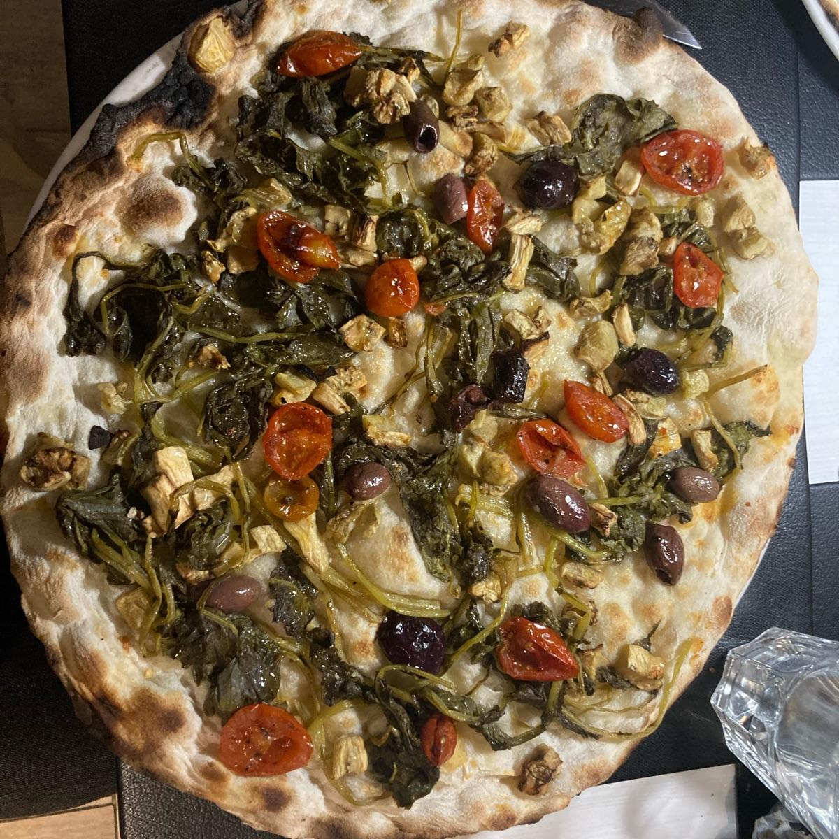 In questa pizzeria non ci sono opzioni vegane nel menu. Ho chiesto una vegetariana senza mozzarella e mi hanno portato questa con olive, pomodorini, friarielli. Ottima, impasto leggero e condimento ricco e abbondante però dovrebbero aumentare l’offerta vegan ed essere più inclusivi