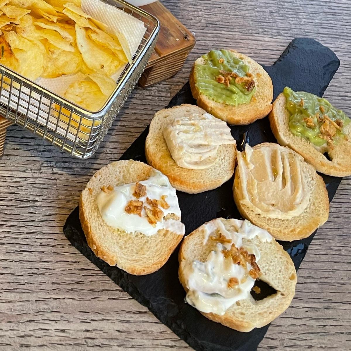 Le altre erano al guacamole e hummus con sopra cipolla croccante. Aggiunta di olive e patatine.