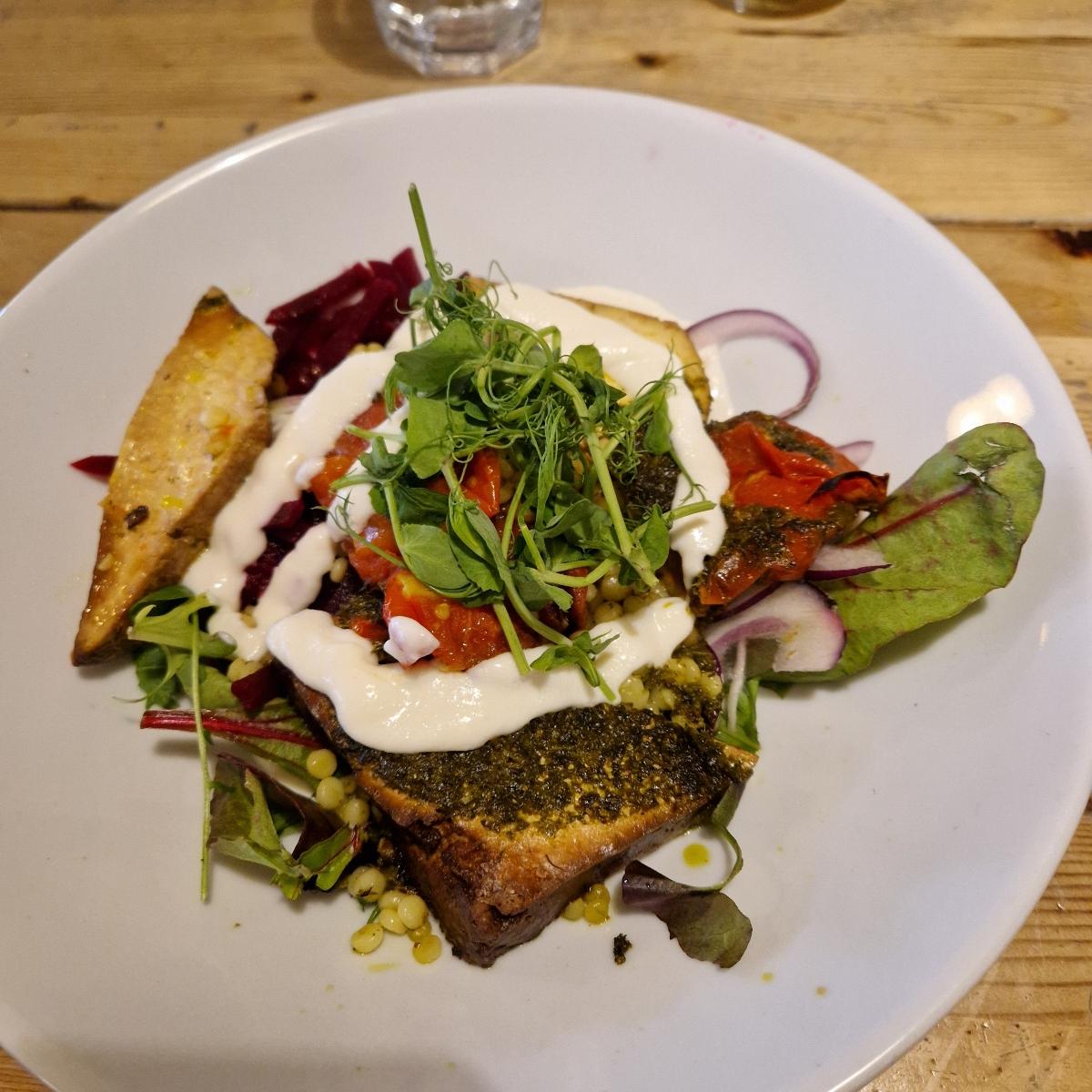 So delicious! The garlicky dressing was perfect, as was the pan seared tofu wedges, served on salad leaves and giant herby cous cous. Satisfying, nutritious and yummy.
