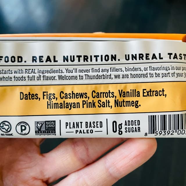 This bar is similar to a Larabar, but thinner, wider and more flexible. I actually love all of the ingredients: dates, figs, carrots, cashews, vanilla, salt, nutmeg - so it would be a wonder if I didn’t enjoy this. And of course I did, it is sweet, chewy and flavorful. I really liked the touch of nutmeg in the bar.