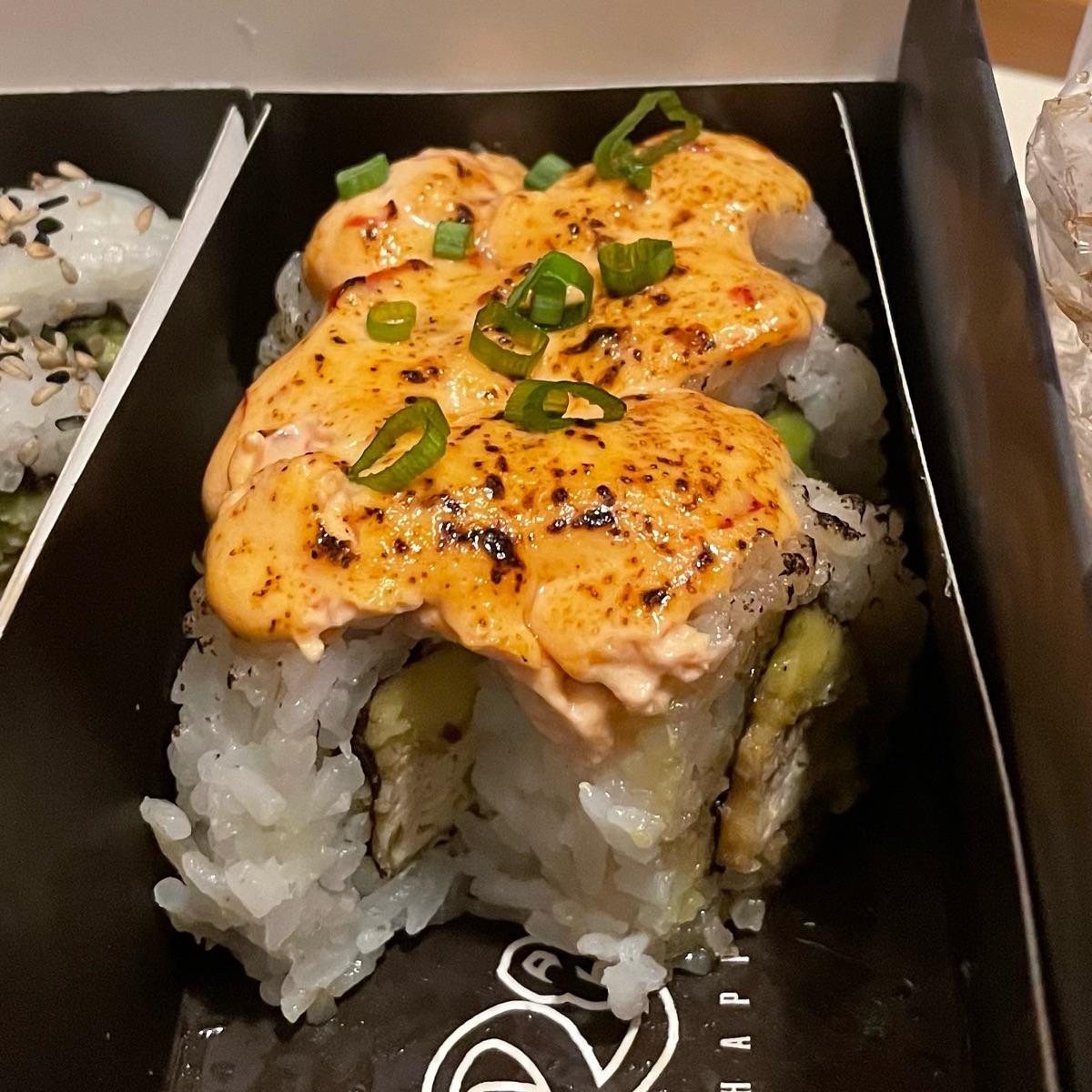 Roll picante cubierto con salsa fuego sopleteada, salsa dulce vegana y negui. Palta y tofu por dentro. Rico pero a mí me picó mucho 🥵