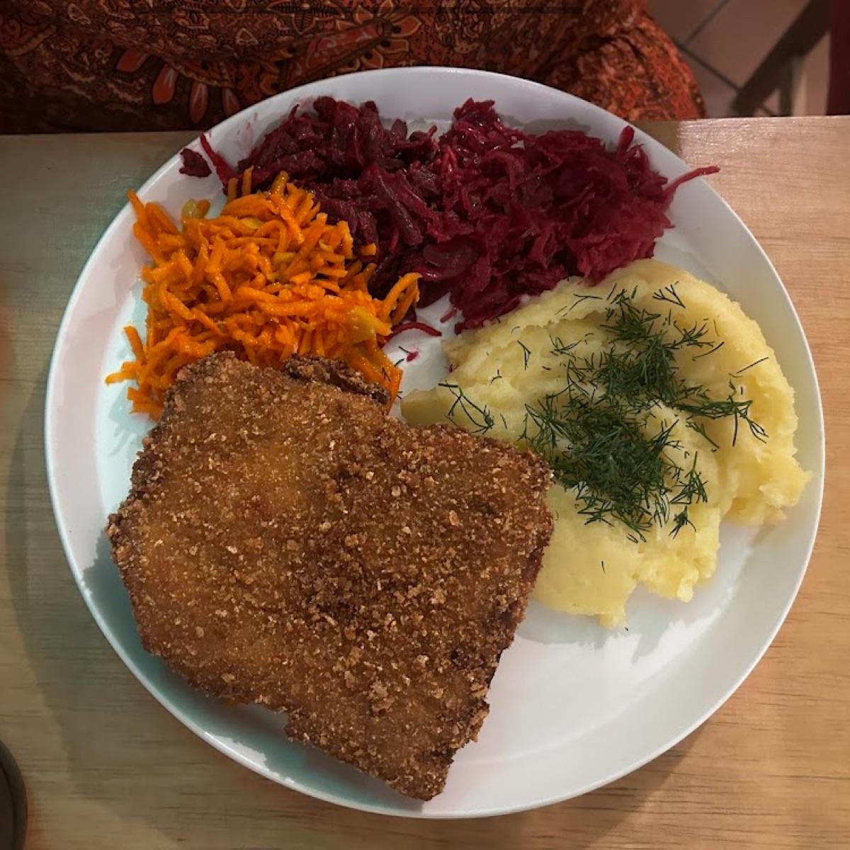 A classic vegan Polish "#porkchop" 🇵🇱 #polishfood It is a breaded #soy cutlet, seasoned with traditional Polish herbs and spices to mimic the flavor of the original dish. The #pork cutlet was crispy on the outside and tender on the inside. Accompanying the "pork chop," you find mashed #potatoes 🥔 infused with #dill, providing a fragrant and herbaceous flavor.