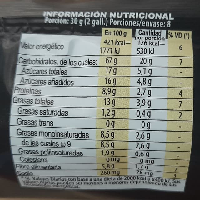 Tiene azúcares, tiene 8,9 gr de proteínas en 100 gr, tiene todas las grasas menos grasas trans, tiene 0 mg de Colesterol, tiene 5,8 gr de fibra alimentaria, 260 mg de Sodio.