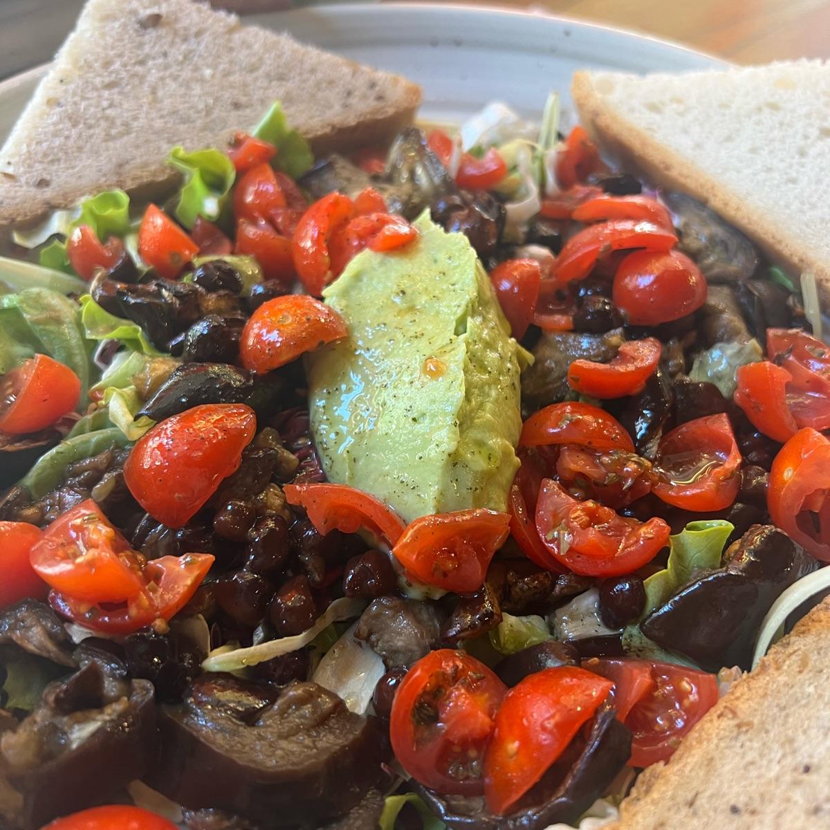 Super buona! Insalata con ceci neri, melanzane appena grigliate, lattuga, pomodori e salsa di avocado. Accompagnata da fette di pane tostato