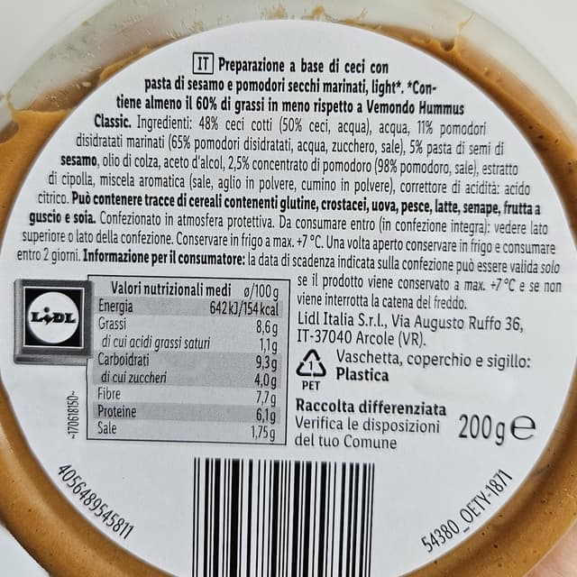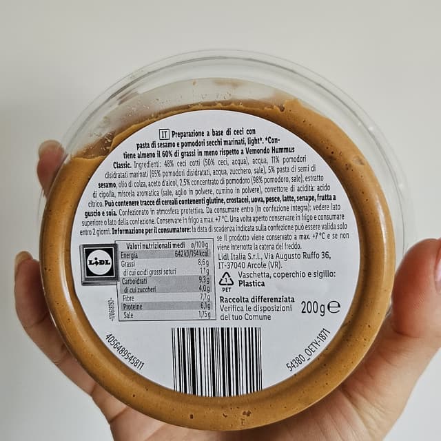 Hummus in versione "light" con pomodori secchi. Devo dire che il gusto è davvero ottimoo, non ha un costo eccessivo e ha quasi la metà delle calorie del classico hummus. Purtroppo non è un prodotto fisso alla Lidl infatti quanso lo trovo faccio scorte e lo congelo. Ottimo! Confezione da 200 gr (due porzioni circa)