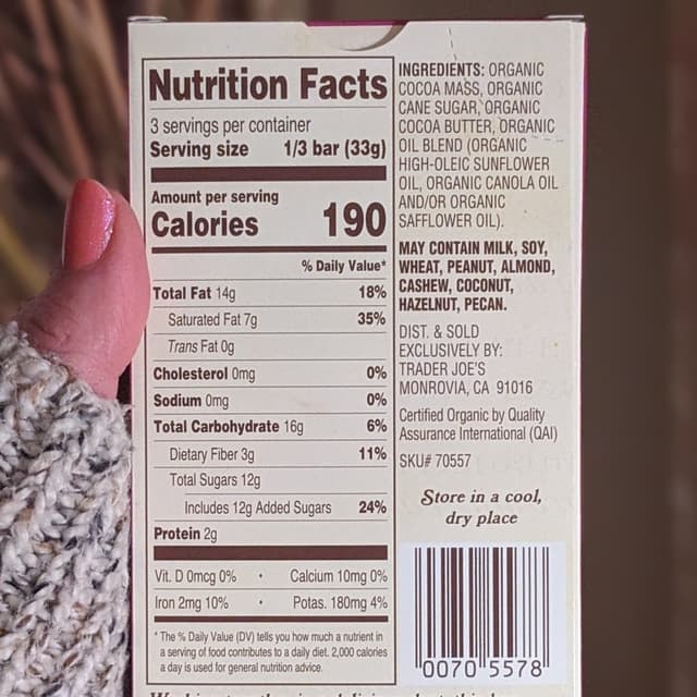 This chocolate bar has a nice creamy texture, but the taste isn't anything special to me. I bet it would be good for dark chocolate s'mores because the creaminess suggests it would melt well. Just eating it as a little dessert at the end of the day, it tasted fine, but there's other chocolate that I'd grab before going for this again.