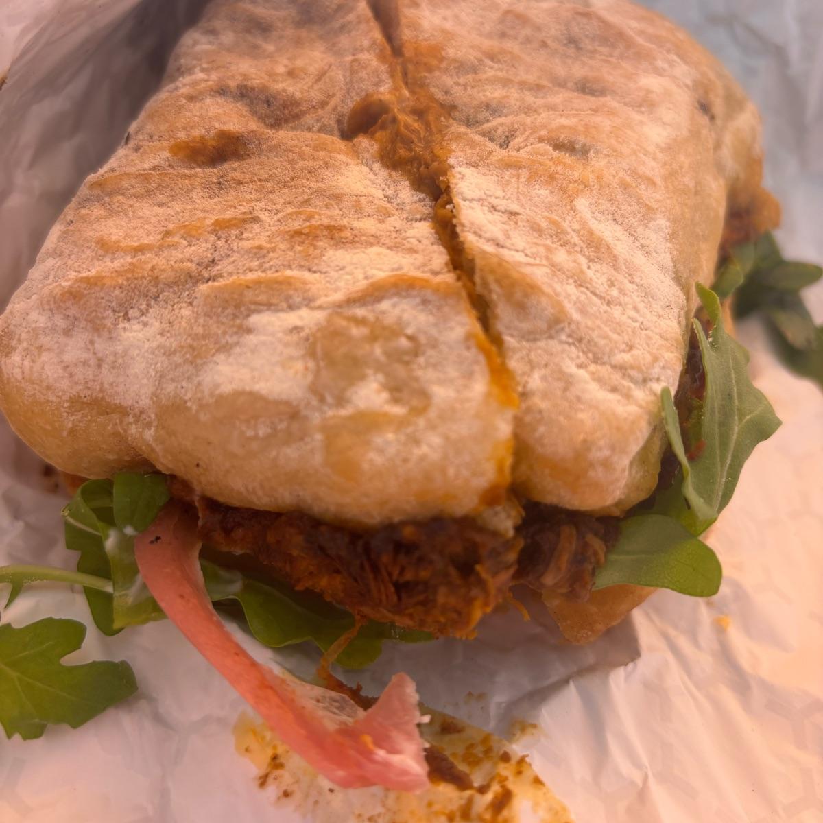 The bread was mu favorite part. The meat is sweet and tender and pairs well with the peppery arugula, pickled onions, and sauce.