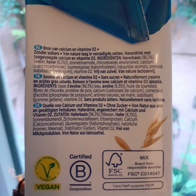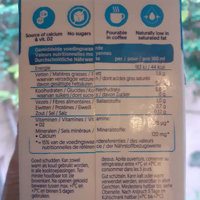 Plant based milk with calcium. Made from oat. Low in saturated fat. No sugar.
