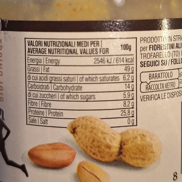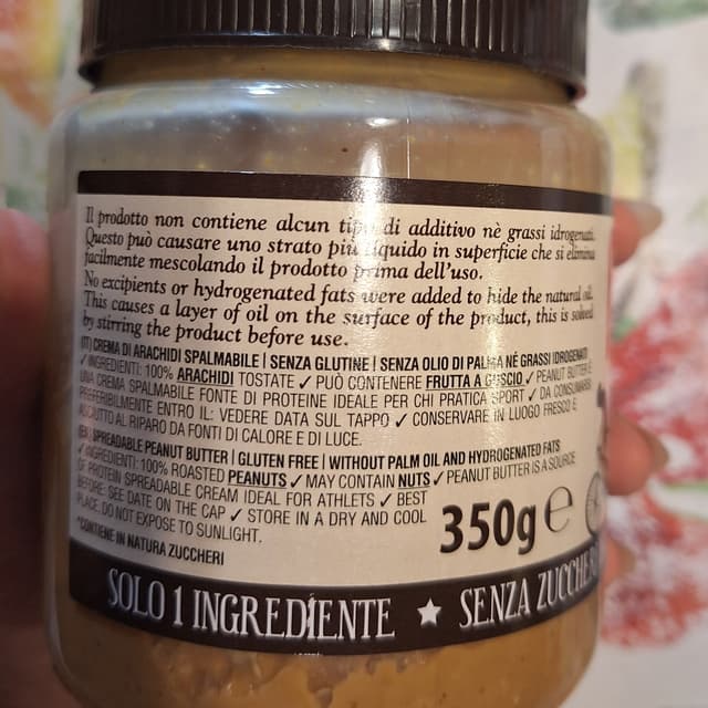 100% di arachidi, senza additivi o altri ingredienti. Ottimo, ovviamente da utilizzare con moderazione dato che contiene molti grassi. Mescolare prima dell'uso.