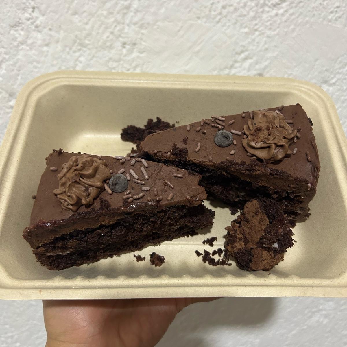 Delicious chocolate cake. It was filled with a chocolate smooth cream, topped with blueberries and chocolate icing.