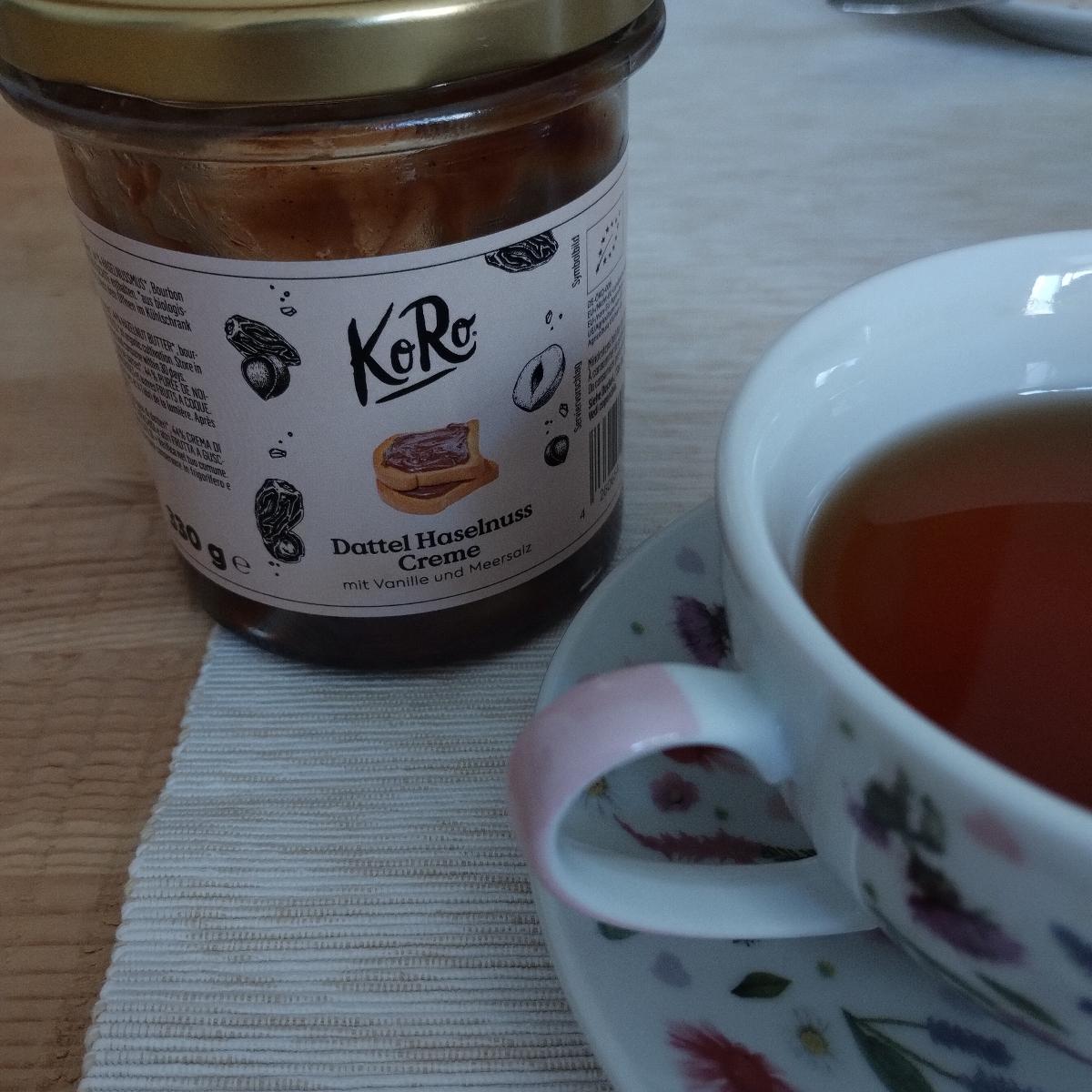 Crema di nocciole e datteri a mio avviso stupefacente. È cremosa e cioccolatosa nonostante gli ingredienti siano rappresentanti soltanto dai datteri e dalle nocciole italiane. Anche se molto dolce, la combinazione di questi due componenti è una trovata, e Koro non delude mai. È buonissima spalmata sul pane con sopra fragole o banana.