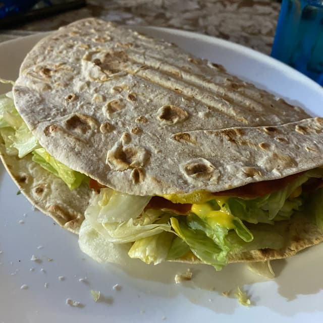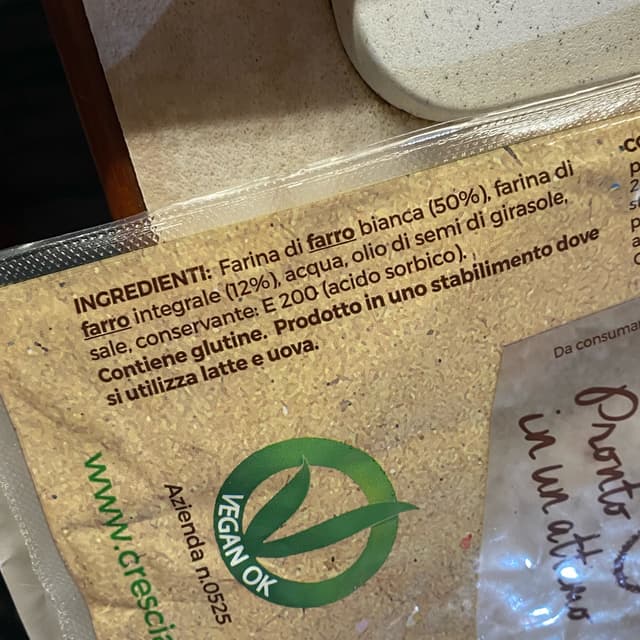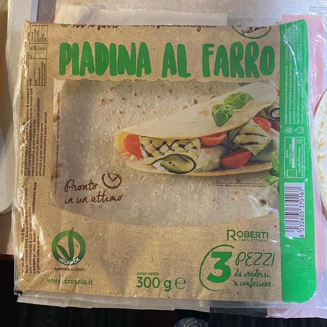 piadine al farro, molto buone, forse un po’ delicate nel senso che nel scaldarla piegata si è rotta 🥲 però sinceramente fa niente ahahah ah ed è leggermente più piccola di altre sul mercato :/
