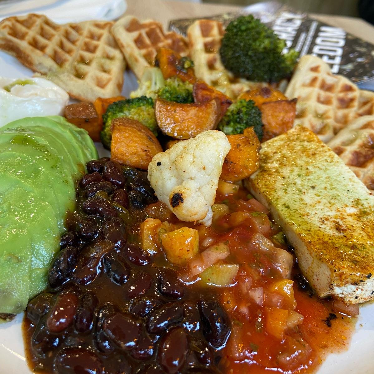 I really enjoyed this dish. It’s very tasty,with multiple levels of flavour, and it filled me quite well. buckwheat waffles with a portion of roast veggies, some tofu, black beans and a mangosalsa. Plus half an avocado and a bit of garlic mayo. The salsa was really tasty, as were the beans, so beautifully cooked. The tofu and veggies were seasoned well. Well yummers. #buckwheat #buckwheatlover #veganwaffles #waffleslover #glutenfree #soy