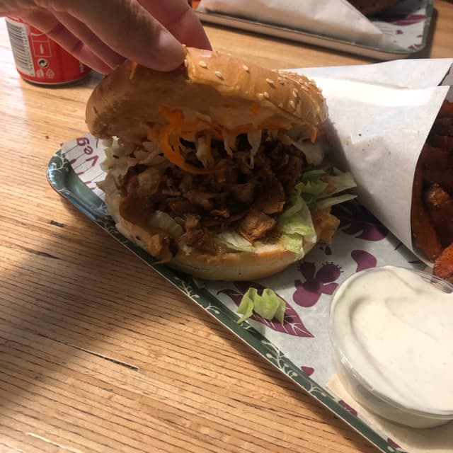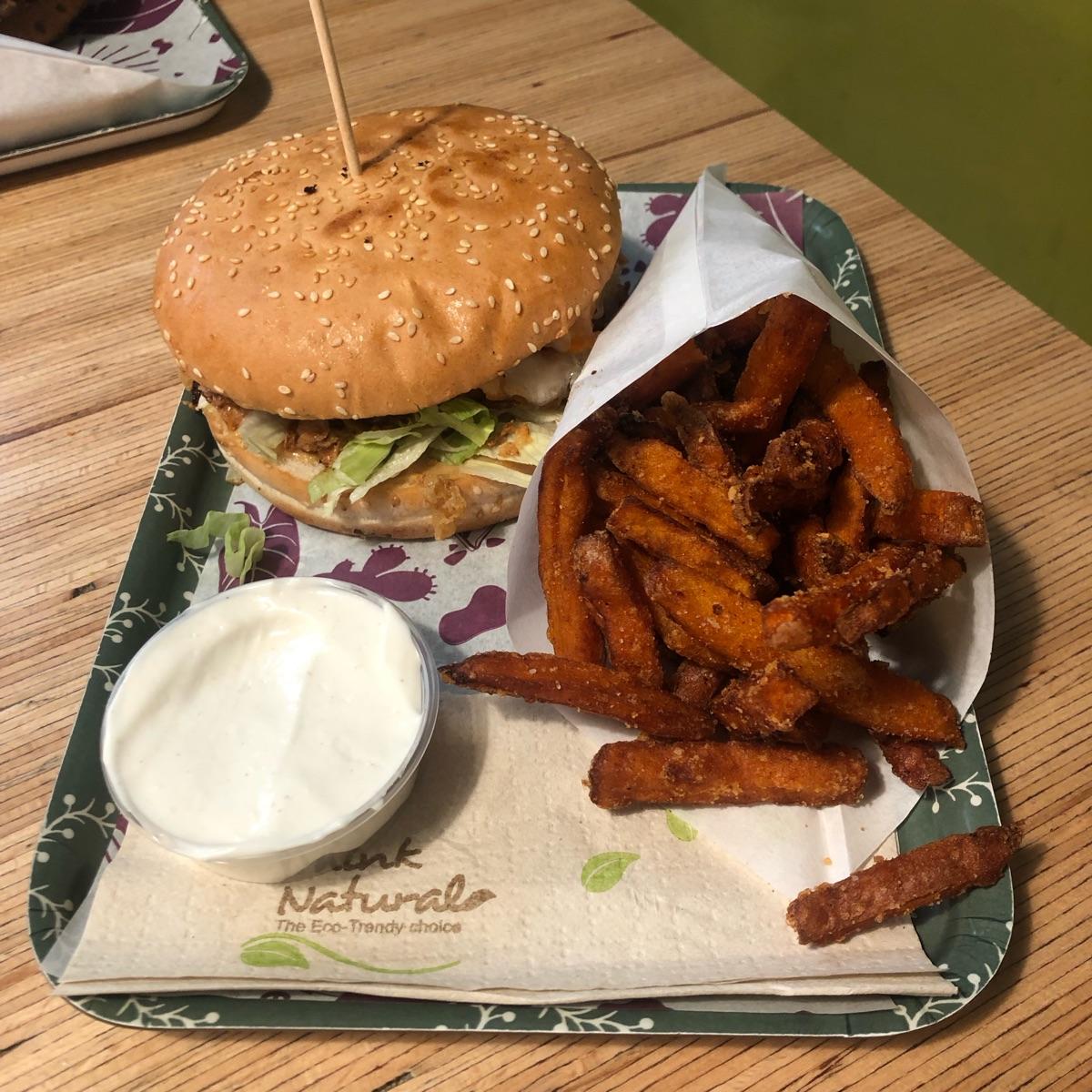 A very saucy and delicious burger. It definitely satisfied my #fastfood craving. I added sweet potato chips and #veganmayo to my order.