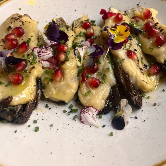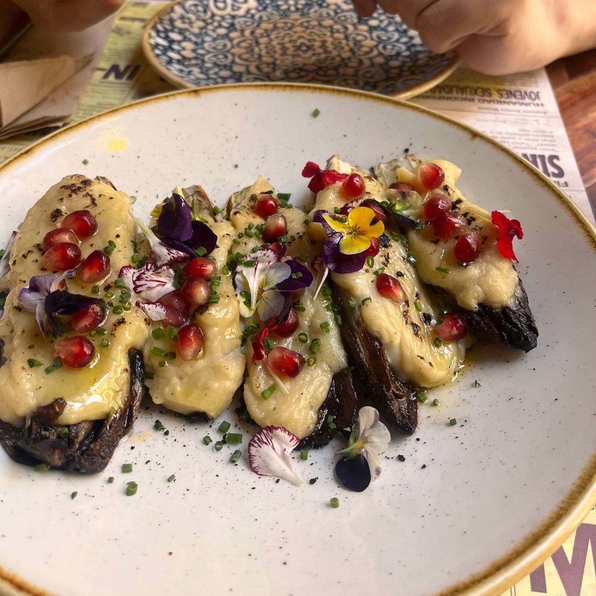 Un entrante muy original. La aceituna la resecan para que quede como arenita. La bechamel vegana es muy suave y el toque de granada le da frescor al plato