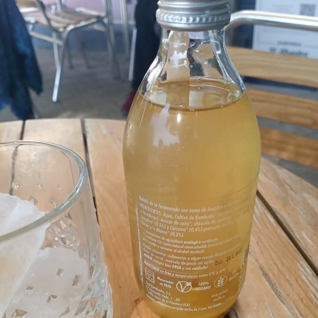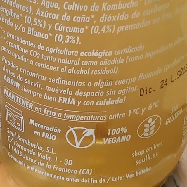 Kombucha con jengibre y cúrcuma, de cultivo #ecologico . Azúcar de caña. Buen sabor, no se nota mucho el jengibre, menos mal porque es un sabor muy fuerte para mi gusto.